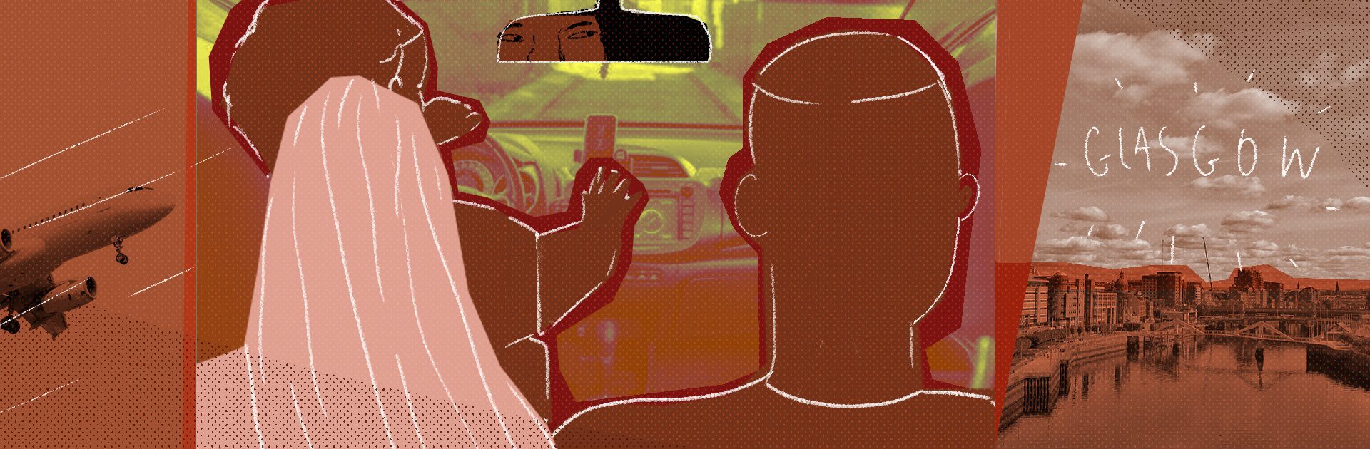 Me voltee para apreciar la vista maravillosa, para no decir surrealista, de Glasgow: la exuberante vegetación en el pavimento que separaba los canales de la autopista, los rascacielos extremadamente altos sin fin, o eso parecía, la belleza de las casas en movimiento mientras nuestro taxi pasaba por ellas a toda velocidad, todo era hermoso. Giré la cara para encontrarme con los ojos del taxista que me miraba mientras conducía. Dios bendiga a los blancos por poner un espejo retrovisor en un auto. Desvié mi mirada cuando su mirada se encontró con la mía y entonces me dispuse a mirar por la ventana para disfrutar más vistas turísticas, cuando de repente…